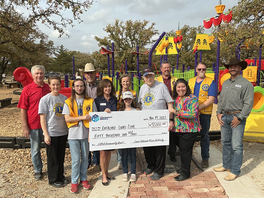 LCRA representatives present a $50,000 grant to the Eastland Lions Club for new all-abilities play equipment. The grant is part of LCRA’s Community Grants program. Pictured, from left to right, are: Larry Vernon, Eastland mayor; Ava Taber, Lions Club member; Jett Whittington, Lions Club secretary, David Hullum, Eastland County judge; Carol Freeman, LCRA Board member; Nakita McBride, Lions Club treasurer; Annalee McBride, Lions Club sweetheart; Dean Vernon, Bobby Blackwell and Meagan Mathis, Lions Club members; Bill Moore, Lions Club president; and Cooper Hogg, LCRA Regional Affairs representative.